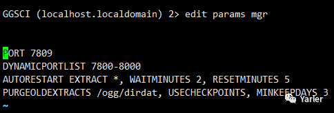 su - oracle cd /ogg ./ggsci edit params mgr //编辑并添加以下参数 PORT 7809 DYNAMICPORTLIST 7800-8000 AUTORESTART EXTRACT *, WAITMINUTES 2, RESETMINUTES 5 PURGEOLDEXTRACTS /data/ogg/dirdat, USECHECKPOINTS, MINKEEPDAYS 3 保存退出 start mgr //启动mgr进程 info mgr //查看mgr信息 |