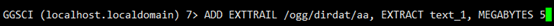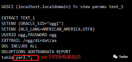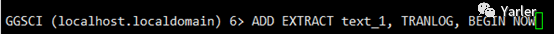 ADD EXTRACT text_1, TRANLOG, BEGIN NOW ADD EXTTRAIL /ogg/dirdat/aa, EXTRACT text_1, MEGABYTES 5 start text_1 //启动extract进程 |