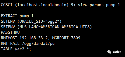 edit params pump_1 //添加Extract配置 EXTRACT pump_1 //名称 SETENV (ORACLE_SID="ogg1") //数据库的SID SETENV (NLS_LANG=AMERICAN_AMERICA.UTF8) //数据库字符集 PASSTHRU RMTHOST 192.168.33.2, MGRPORT 7809 //目标库IP和端口 RMTTRAIL /ogg/dirdat/pu //导出目录 table yar2.*; //同步yar2用户下的所有表 ADD EXTRACT pump_1, EXTTRAILSOURCE /ogg/dirdat/aa //指定本地trail文件 ADD RMTTRAIL /data/ogg/dirdat/pa, EXTRACT PORA_1, MEGABYTES 5 //指定远程trail文件 start pump_1 //启动Pump进程 |