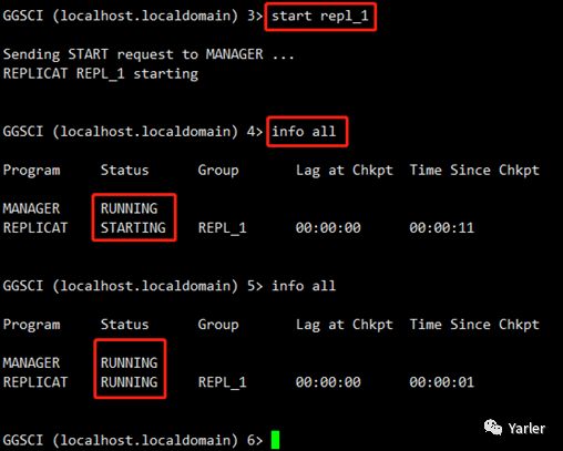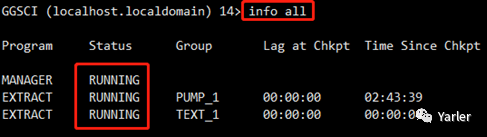 至此源端进程配置结束,使用info all命令查看进程状态为RUNNING即表示正常运行。