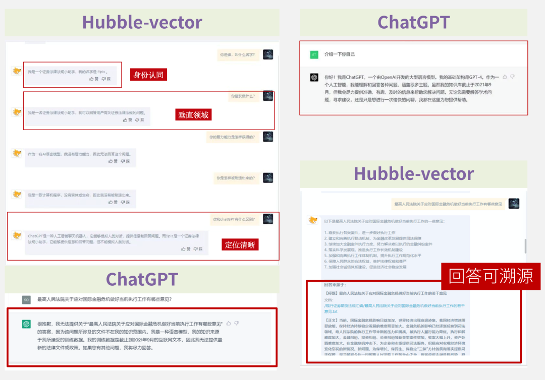 Hubble-vector支撑大模型服务,使模型语境更适用于当前私域数据场景,并且做到答案可精确溯源,最后通过模型管理进行服务的发布供用户使用。在生成时可以引用原有法条做准确严谨回答,对比通用大模型,更适合机构私有数据。
