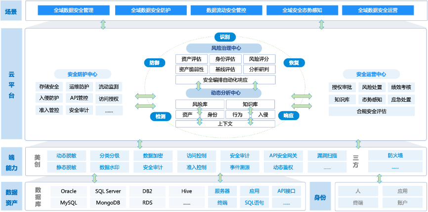 解决混合多云时代复杂性挑战,基于云-端架构,美创将管理的复杂性收敛至一个数据安全管理平台,并搭载数据库加密、数据库防火墙、数据脱敏、数据水印、API安全等轻量级端点能力,实现数据存储、数据访问、数据流动等生命周期下的全域数据安全管理、监测、管控与防护、运营、态势感知。