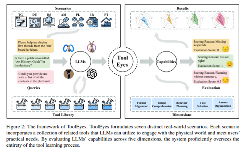 为了解决这个问题,我们提出了ToolEyes,专门用于细粒度评估LLMs在真实场景中工具学习能力。该系统建模了七个真实场景,分析了LLMs在工具学习中至关重要的五个能力维度:格式对齐、意图理解、行为规划、工具选择和答案组织。