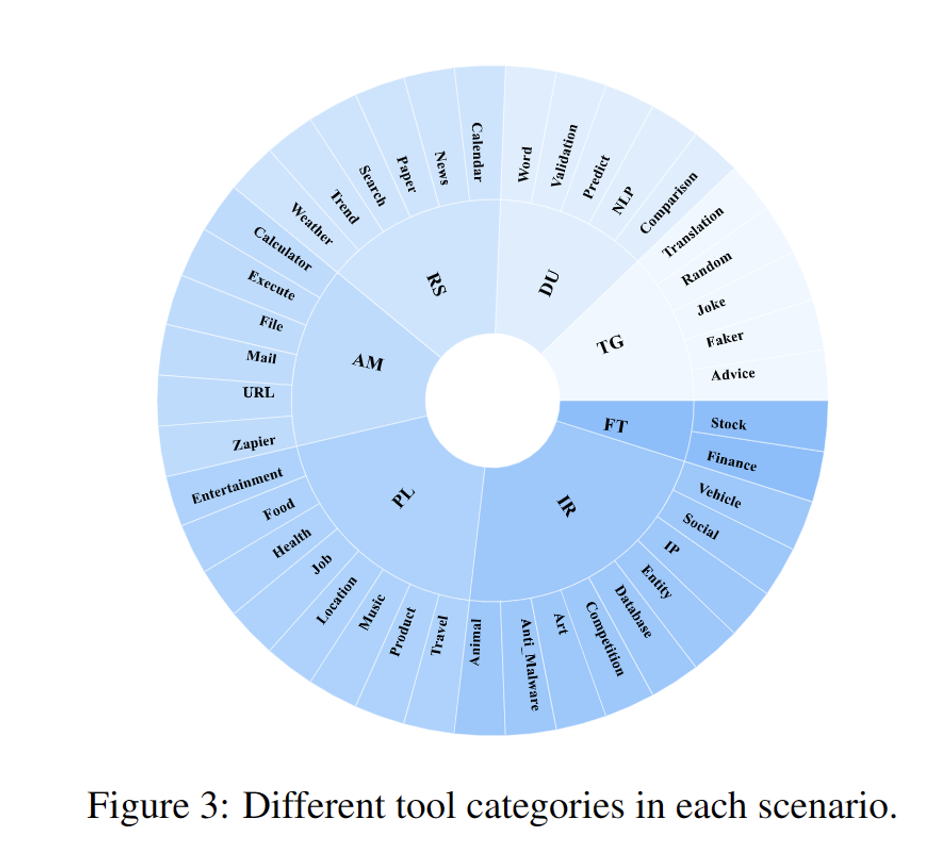 金融交易(FT)包括需要专业金融和经济知识的场景,需要LLMs使用工具获取相关金融信息并进行分析,以解决用户的问题或提供相关建议,其中可能涉及对股票走势或汇率波动的讨论。 基于这些场景,我们收集了将近600个工具,作为LLMs与物理世界的交互接口。