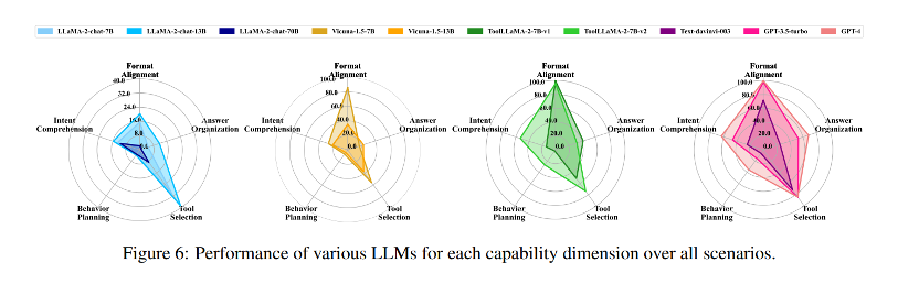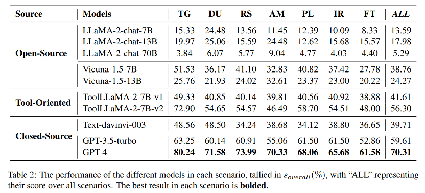 在对各种源 LLM 的工具学习能力进行评估后,GPT-4在所有场景下都具有优势。值得注意的是,现有的开源 LLMs 在工具学习方面表现不佳。