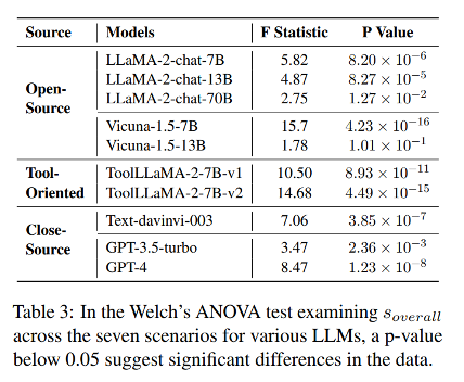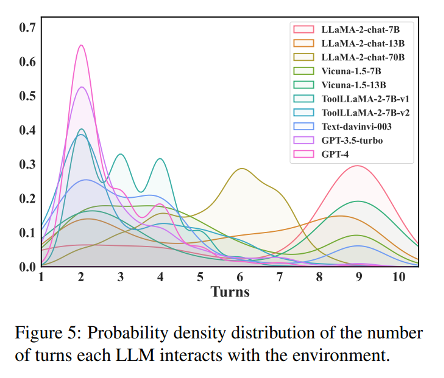 我们分析了各种场景下的数据,研究了不同 LLMs 与环境交互次数的分布情况。与通常需要多次交互才能完成任务的开源 LLMs相比,擅长工具学习任务的工具导向型和闭源 LLMs 可以在有限的交互次数内高效解决问题并满足用户需求。LLaMA-2-chat-7B 平均需要 7.0 个交互回合,大大高于 ToolLLaMA-2-7b-v2 的 3.1 个回合和 GPT-4 的 2.8 个回合。