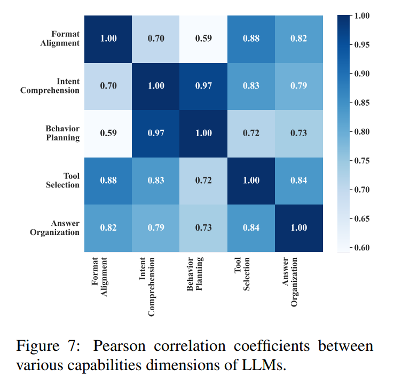 我们仔细研究了五个能力维度的表现,并计算了皮尔逊相关系数,分析发现,大多数LLMs能力之间存在正相关。这说明工具学习是一个多方面的过程,需要多种能力的协同作用。因此,对工具学习的评估不应局限于对工具选择结果的评估。