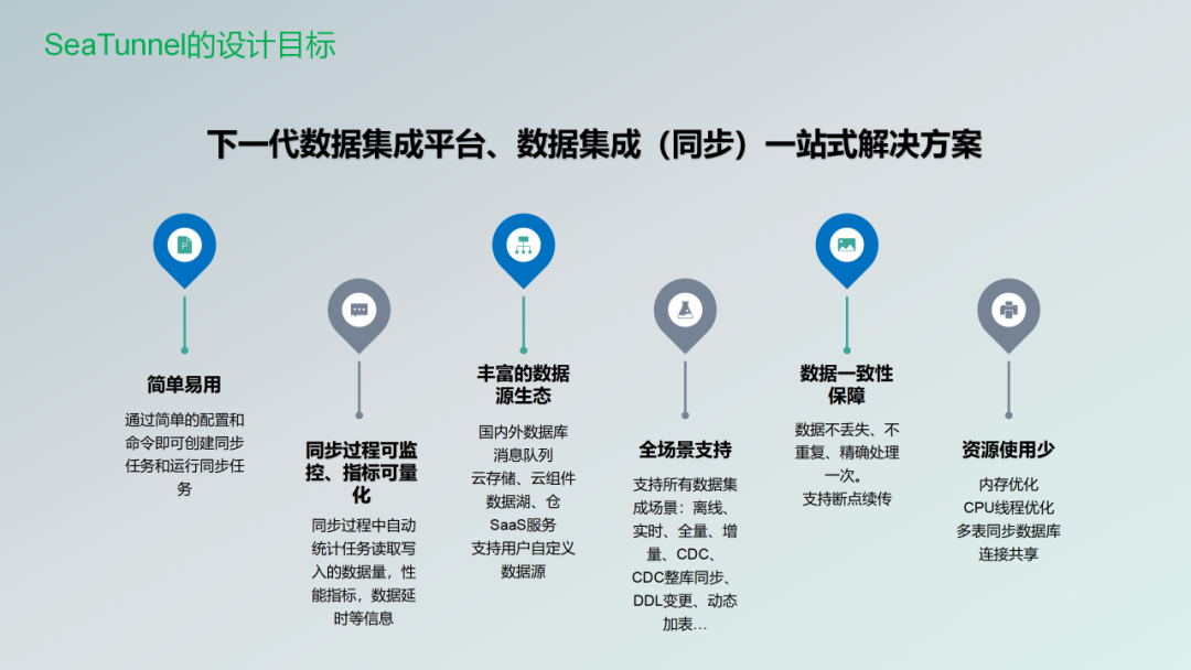 - 全场景的支持,包括数据集成的一些离线的,实时的,全量的增量的,CDC的,以及CDC的一些整库同步,然后DDL变更、动态加表,这些特性已经都支持了。数据一致性的保障,它可以保障数据不丢失,不重复。精确处理一次,包括支持断点续传。