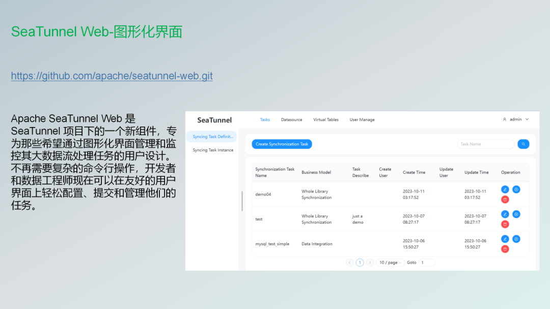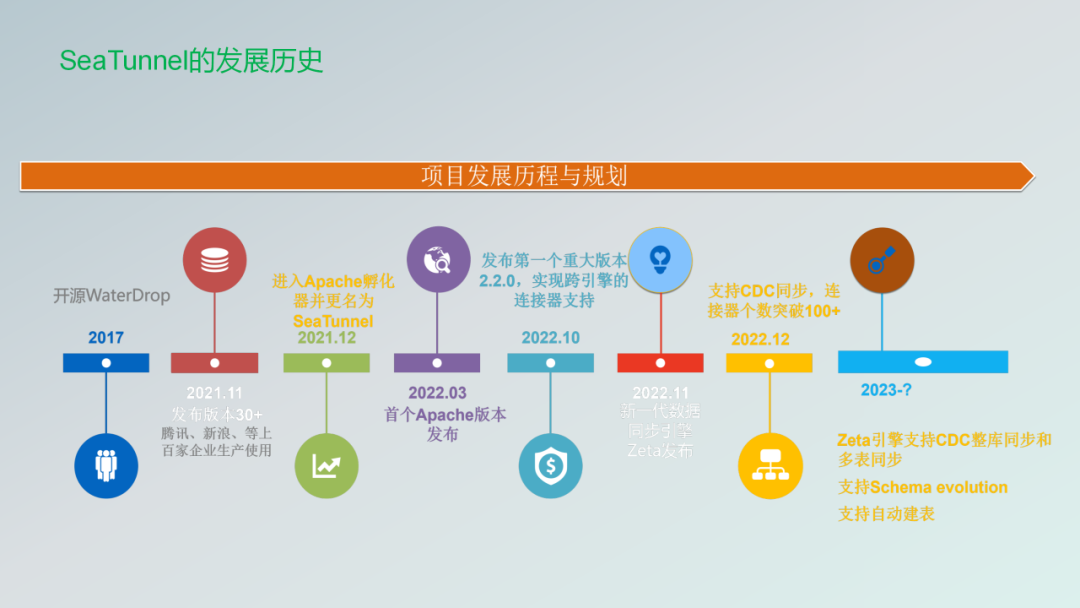 Apache SeaTunnel 是一个分布式、高性能、易扩展、用于海量数据(离线&实时)同步和转化的数据集成平台https://github.com/apache/seatunnelhttps://seatunnel.apache.org/https://seatunnel.apache.org/download我们相信,在「Community Over Code」(社区大于代码)、「Open and Cooperation」(开放协作)、「Meritocracy」(精英管理)、以及「多样性与共识决策」等 The Apache Way 的指引下,我们将迎来更加多元化和包容的社区生态,共建开源精神带来的技术进步!我们诚邀各位有志于让本土开源立足全球的伙伴加入 SeaTunnel 贡献者大家庭,一起共建开源!https://github.com/apache/seatunnel/issueshttps://github.com/apache/seatunnel/pullsdev-subscribe@seatunnel.apache.orghttps://join.slack.com/t/apacheseatunnel/shared_invite/zt-1kcxzyrxz-lKcF3BAyzHEmpcc4OSaCjQhttps://twitter.com/ASFSeaTunnel