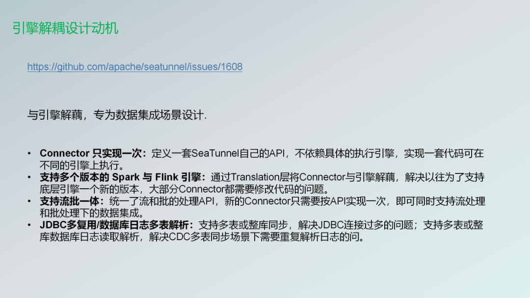 然后就讲一下第一个社区重大贡献的引擎解耦设计。因为它才让社区发展的非常迅速,包括连接器的接入变得非常简单。与引擎解耦专为数据集成场景设计。- 连接器适配繁杂第一个就是以前在这个特性之前。想接入一个connector是非常麻烦的,就如果你要适配的话Flink,他们要接入的适配Flink的一个的特性,然后还要接Spark的话,可能还要再改一下代码,让它适配Spark是非常复杂的。可能这个引擎可能这个connect可能只支持Flink,或者说只支持Spark。后期维护也是非常困难的。自从引擎解耦进来了之后,connector只需要实现一次了。