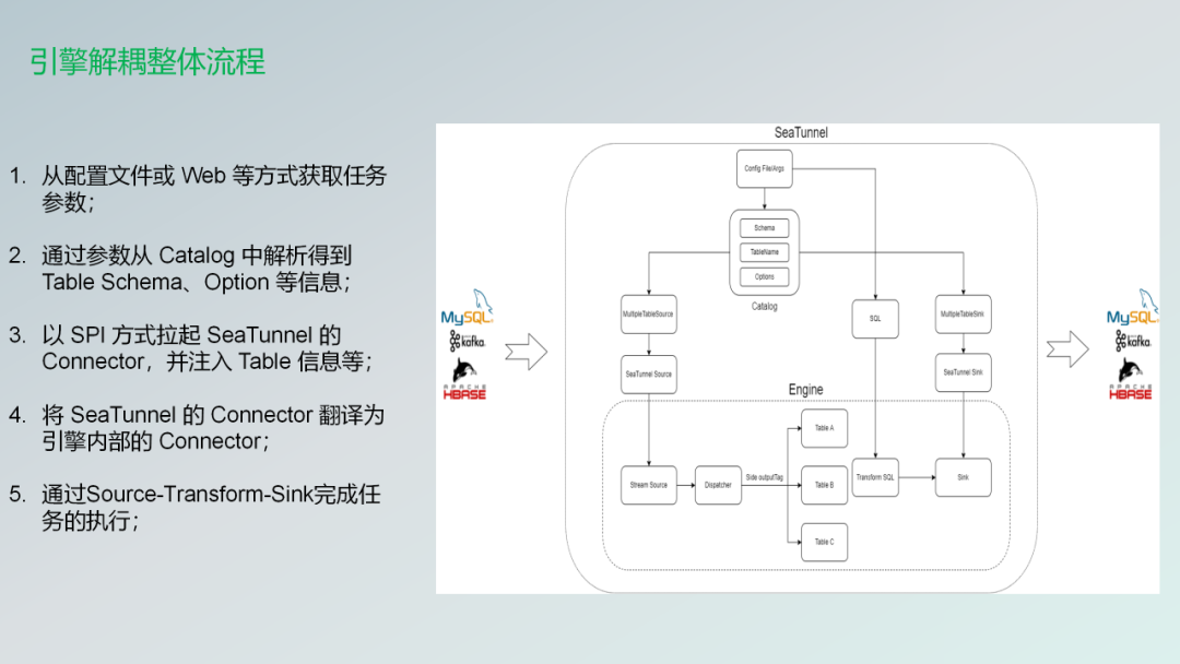 - 第三步就是我们基于SPI的方式通过让SeaTunnel拉起connector。把这些table的信息注入到connector里边。让connector可以得到需要拉取的信息。