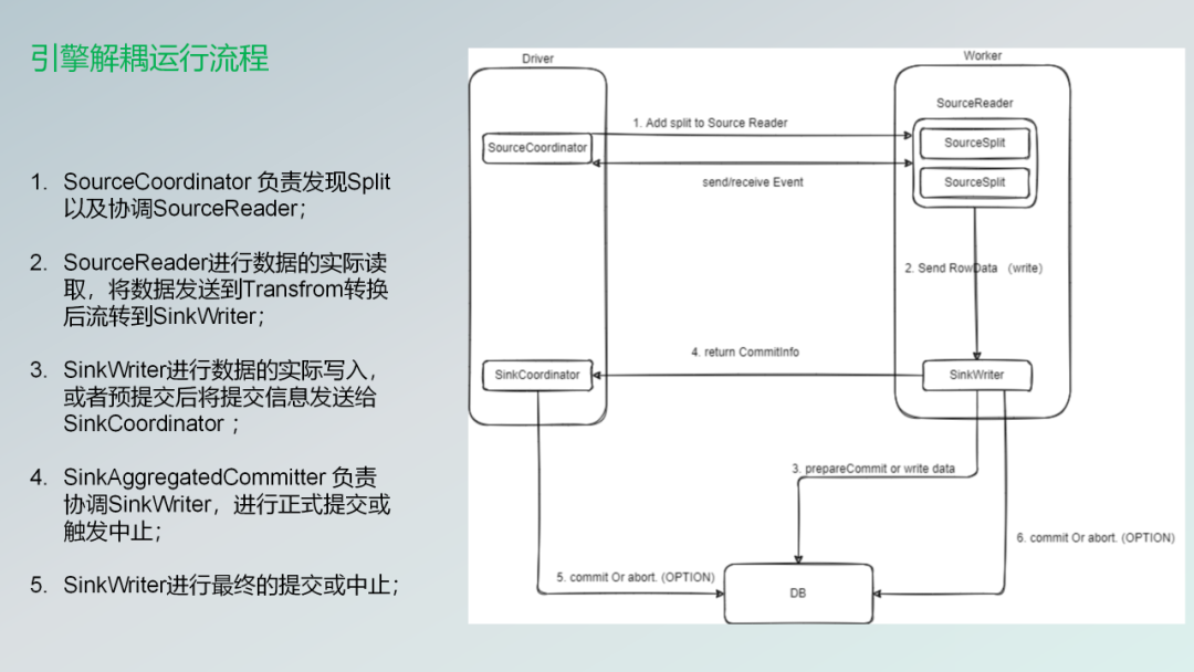 - 第四步SinkAggregatedCommitter负责协调SinkWriter,进行正式提交或触发中止.