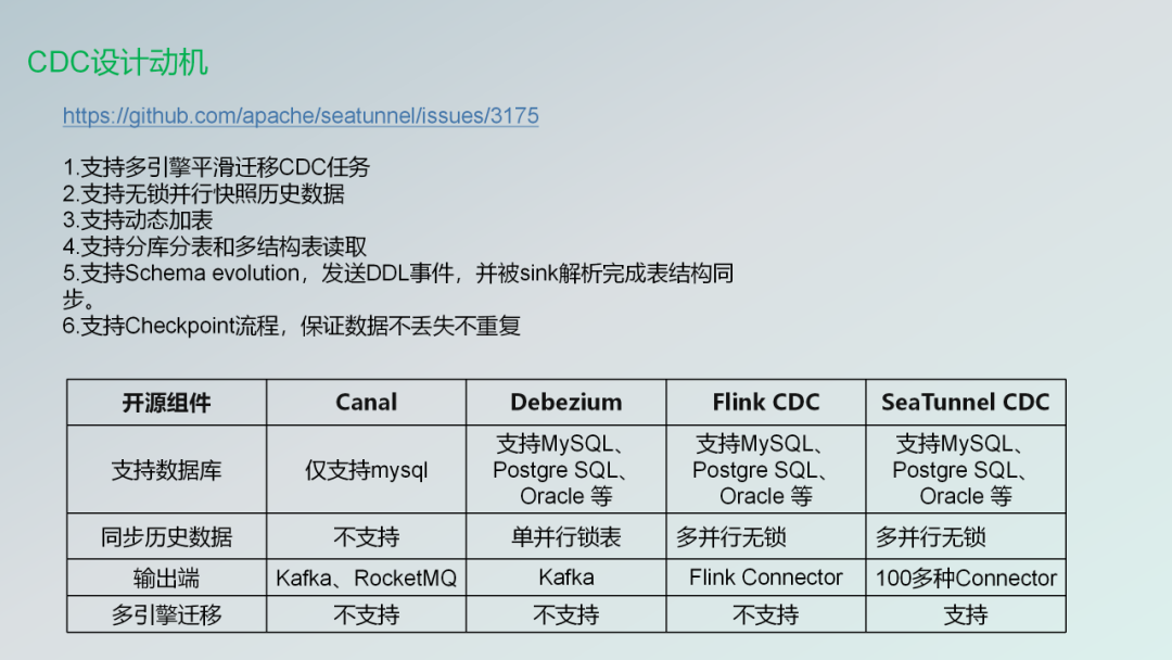 因为市面上像FlinCDC、Debezium、Canal等CDC组件也有一些比较好的,或者说已经有这些组件了,为什么还要设计SeaTunnel自己的CDC组件?- 支持Schema evolution,发送DDL事件,并被sink解析完成表结构同步。