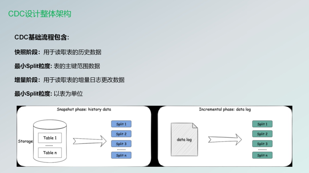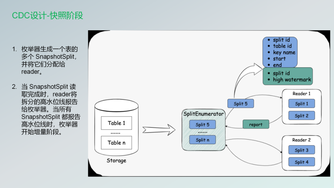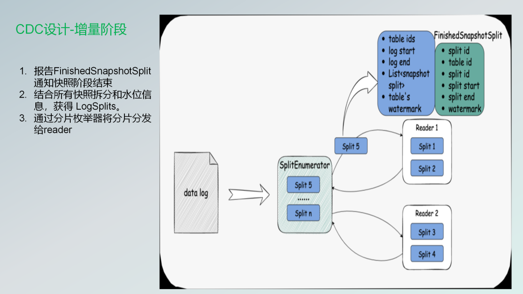 快照数据读取完之后,然后再解锁之后再去进行下面的流式的数据的读取。上面这张图就是两个阶段需要做的事情。枚举器Snapshotsplint把它们发送给不同的reader。第二个阶段就是Split读取完成的时候Reader会将拆分的高水位线报告给枚举器。通知枚举器之后,让枚举器进行下一个增量的阶段。CDC的增量阶段