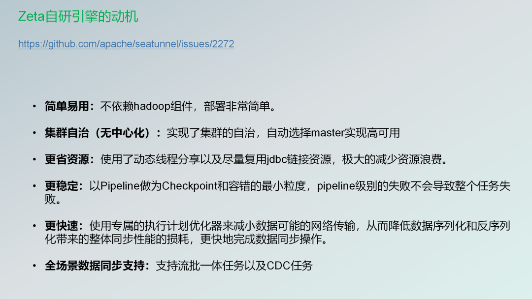 SeaTunnel的自研引擎Zeta,当时是我进入社区的时候对这块比较感兴趣。Zeta Engine 是一个专门为数据同步场景设计和开发的数据同步引擎,更快、更稳定、更省资源也更加易用。- 集群自治(无中心化):实现了集群的自治,自动选择master实现高可用