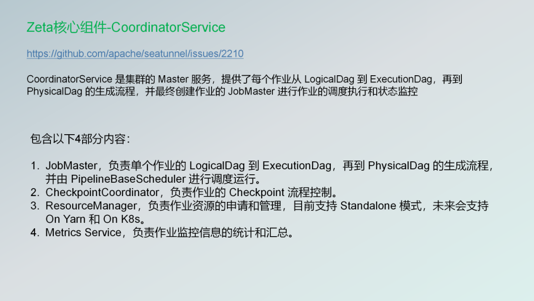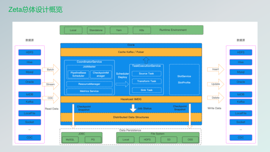 这张图就是也是从社区的官网拿过来的。主要的话也是可以分为五部分,就是数据源那块儿的话就不用讲了,就是那些connector。然后上游的话最上面绿色的这块是运行的那些资源。一个任务需要从一个地方去拿到资源,现在我们已经支持了Standlone,未来的话Yarn会支持的话checkpoint存储,如果有了解Zeta的朋友的话,就知道它是基于hazelcast做的,它是自己就是有一套专门的让数据可以在集群里边传输,可以保证那个数据在每个地方都可以拿到,也支持高可用,目前来讲已经支持了,就是HDFS、S3、OSS上面的一个数据的保存,未来的话也是会支持JDBC的一些数据保存,比如说可以把那些checkpoint存储的数据去保存在我们的MySQL,或者说PG上面。第一个核心的组件就是Zeta的核心组件,它是那个CoordinatorService,如果知道Zeta,其实它就是一个CS架构,就是客户端,然后把数据配置好的Config文件,然后处理完了之后,然后丢到我们的Service里边,Service去基于我们那些Worker节点上面的那些资源,然后把这些任务通过DAG,然后把它拆成一些算子,然后把这些算子会丢到不同的那个Worker上面去,然后去调度执行。第一个核心的组件CoordinatorService 是集群的 Master 服务,提供了每个作业从 LogicalDag 到 ExecutionDag,再到 PhysicalDag 的生成流程,并最终创建作业的 JobMaster 进行作业的调度执行和状态监控- JobMaster,负责单个作业的 LogicalDag 到 ExecutionDag,再到 PhysicalDag 的生成流程,并由 PipelineBaseScheduler 进行调度运行。