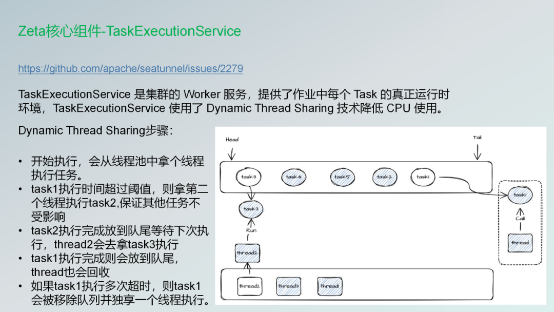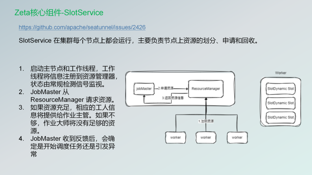 下面一个核心的组件就是TaskExecutionService 是集群的 Worker 服务,提供了作业中每个 Task 的真正运行时环境,TaskExecutionService 使用了 Dynamic Thread Sharing 技术降低 CPU 使用。什么意思呢?就是我们不需要每一个任务过来的时候都要独占一个独占线程,然后让它运行完了才结束。有些任务如果是那种大表的话,人家小表的话,就是通过这个线程就可以结束了。如果那些大表的话,会可能会把这个资源给独占了,就是我们可能会运行到最后,所有的那些任务都由那些比较大的表给独占了,然后那些小表可能就没有得到资源去运行。所以通过这种技术,我们就可以让资源比较大的就是耗时比较长的那些任务会独占一个线程,让他去跑在另外一个地方去跑。而其他的那些小表的话,可以在这个线程里面去共享所有的资源。保证我们每一个任务都可以得到cpu的运行时间。第三个组件的话是资源申请的一个组件。SlotService 在集群每个节点上都会运行,主要负责节点上资源的划分、申请和回收。- 启动主节点和工作线程,工作线程将信息注册到资源管理器,状态由常规检测信号监视。