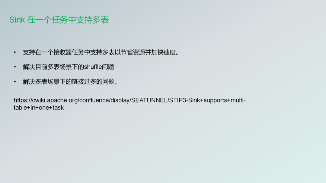 第五部分的话,如果有感兴趣的开发者的话,如果近期想参与Apache的开源社区,或者说像没有了解过开源文化的朋友。也想参与开源的,甚至不知道如何提交代码的?欢迎来社区跟我交流!我会先分享一下目前这个SeaTunnel社区有几个正在做的一个比较大的特性,然后特性最近也在包括设计已经完成了,现在正在疯狂的提交代码。第一个就是我们可以在Sink里面一个这任务当中可以支持多表了,然后这个我在下面贴了conference[1]的一个链接