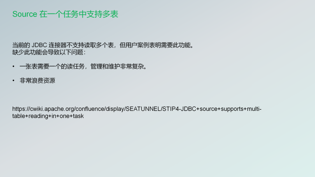 - JDBC的复用包括连接池的复用、数据库的日志多表解析等等。就是实时多表或者整库同步解决JDBC连接过多的问题,以及多表或整库数据库日志读取解析,以及解决CDC多表场景下的一些重复的解析的问题。这也是在设计当中得到了支持。这也是设计的动机!
