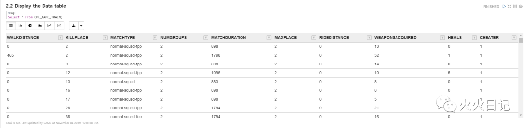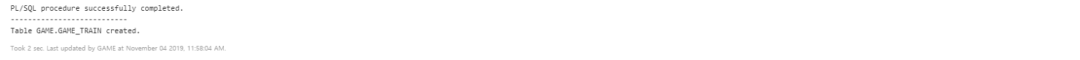 %script/* Create PUGB_TRAIN Table on Jett user. drop exist table */BEGINEXECUTE IMMEDIATE 'DROP Table JETTLIU.PUBG_TRAIN';EXCEPTIONWHEN OTHERS THEN NULL;END;//* Create PUBG_TRAIN on Jett user. */CREATE Table jettliu.PUBG_TRAINAS SELECT ID, GROUPID, MATCHID, ASSISTS, BOOSTS, DAMAGEDEALT, DBNOS, HEADSHOTKILLS, HEALS, KILLPLACE, KILLPOINTS, KILLS, KILLSTREAKS, LONGESTKILL, MATCHDURATION, MATCHTYPE, MAXPLACE, NUMGROUPS, RANKPOINTS, REVIVES, RIDEDISTANCE, ROADKILLS, SWIMDISTANCE, TEAMKILLS, VEHICLEDESTROYS, WALKDISTANCE, WEAPONSACQUIRED, WINPOINTS, WINPLACEPERC, CHEATERFROM JETTLIU.PUBGDATA