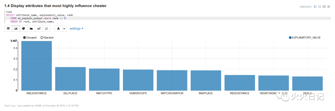 %script/* Find the importance of attributes that independently impact the target attribute: Cheater */BEGINEXECUTE IMMEDIATE 'DROP TABLE ai_explain_output';EXCEPTIONWHEN OTHERS THEN NULL;END;/BEGINDBMS_PREDICTIVE_ANALYTICS.EXPLAIN(data_table_name => 'PUBG_TRAIN',explain_column_name => 'CHEATER',result_table_name => 'ai_explain_output');END;