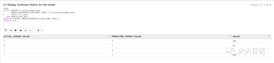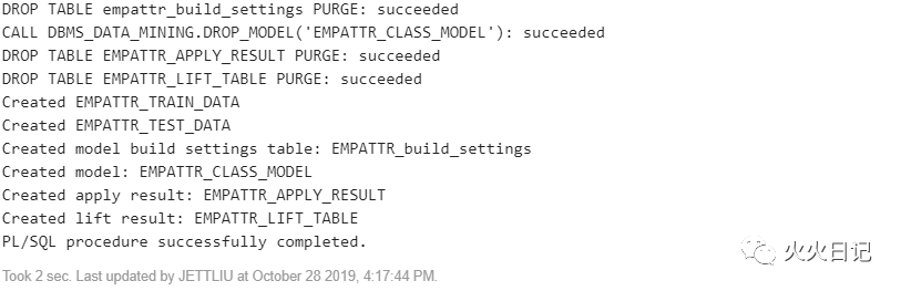 %script/* Build a classification model and then generate a lift test result and an apply result. */DECLAREv_sql varchar2(100);Begin/* drop build settings */BEGINv_sql := 'DROP TABLE empattr_build_settings PURGE';EXECUTE IMMEDIATE v_sql;DBMS_OUTPUT.PUT_LINE (v_sql ||': succeeded');EXCEPTIONWHEN OTHERS THENDBMS_OUTPUT.PUT_LINE (v_sql ||': drop unneccessary - no table exists');END;/* drop model */BEGINv_sql := 'CALL DBMS_DATA_MINING.DROP_MODEL(''EMPATTR_CLASS_MODEL'')';EXECUTE IMMEDIATE v_sql;DBMS_OUTPUT.PUT_LINE (v_sql ||': succeeded');EXCEPTIONWHEN OTHERS THENDBMS_OUTPUT.PUT_LINE (v_sql ||': drop unneccessary - no model exists');END;/* drop apply result */BEGINv_sql := 'DROP TABLE EMPATTR_APPLY_RESULT PURGE';EXECUTE IMMEDIATE v_sql;DBMS_OUTPUT.PUT_LINE (v_sql ||': succeeded');EXCEPTIONWHEN OTHERS THENDBMS_OUTPUT.PUT_LINE (v_sql ||': drop unneccessary - no table exists');END;/* drop lift result */BEGINv_sql := 'DROP TABLE EMPATTR_LIFT_TABLE PURGE';EXECUTE IMMEDIATE v_sql;DBMS_OUTPUT.PUT_LINE (v_sql ||': succeeded');EXCEPTIONWHEN OTHERS THENDBMS_OUTPUT.PUT_LINE (v_sql ||': drop unneccessary - no table exists');END;/* Split the Data into N1_TRAIN_DATA and N1_TEST_DATA */EXECUTE IMMEDIATE 'CREATE OR REPLACE VIEW EMPATTR_TRAIN_DATA AS SELECT * FROM PUBG_TRAIN SAMPLE (60) SEED (1)';DBMS_OUTPUT.PUT_LINE ('Created EMPATTR_TRAIN_DATA');EXECUTE IMMEDIATE 'CREATE OR REPLACE VIEW EMPATTR_TEST_DATA AS SELECT * FROM PUBG_TRAIN MINUS SELECT * FROM EMPATTR_TRAIN_DATA';DBMS_OUTPUT.PUT_LINE ('Created EMPATTR_TEST_DATA');/* Create a Build Setting (DT) for Model Build */EXECUTE IMMEDIATE 'CREATE TABLE EMPATTR_build_settings (setting_name VARCHAR2(30),setting_value VARCHAR2(4000))';EXECUTE IMMEDIATE 'INSERT INTO EMPATTR_build_settings (setting_name, setting_value) VALUES (''ALGO_NAME'', ''ALGO_DECISION_TREE'')';EXECUTE IMMEDIATE 'INSERT INTO EMPATTR_build_settings (setting_name, setting_value) VALUES (''PREP_AUTO'', ''ON'')';DBMS_OUTPUT.PUT_LINE ('Created model build settings table: EMPATTR_build_settings ');/* Build a Classification Model */EXECUTE IMMEDIATE 'CALL DBMS_DATA_MINING.CREATE_MODEL(''EMPATTR_CLASS_MODEL'', ''CLASSIFICATION'', ''EMPATTR_TRAIN_DATA'', ''ID'',''CHEATER'', ''EMPATTR_build_settings'')';DBMS_OUTPUT.PUT_LINE ('Created model: EMPATTR_CLASS_MODEL ');/* Test the Model by generating a apply result and then create a lift result */EXECUTE IMMEDIATE 'CALL DBMS_DATA_MINING.APPLY(''EMPATTR_CLASS_MODEL'',''EMPATTR_TEST_DATA'',''ID'',''EMPATTR_APPLY_RESULT'')';DBMS_OUTPUT.PUT_LINE ('Created apply result: EMPATTR_APPLY_RESULT ');EXECUTE IMMEDIATE 'CALL DBMS_DATA_MINING.COMPUTE_LIFT(''EMPATTR_APPLY_RESULT'',''EMPATTR_TEST_DATA'',''ID'',''CHEATER'',''EMPATTR_LIFT_TABLE'',''1'',''PREDICTION'',''PROBABILITY'',100)';DBMS_OUTPUT.PUT_LINE ('Created lift result: EMPATTR_LIFT_TABLE ');END;