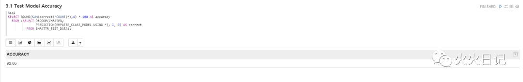 %sqlSELECT ROUND(SUM(correct)/COUNT(*),4) * 100 AS accuracy FROM (SELECT DECODE(CHEATER, PREDICTION(EMPATTR_CLASS_MODEL USING *), 1, 0) AS correct FROM EMPATTR_TEST_DATA);