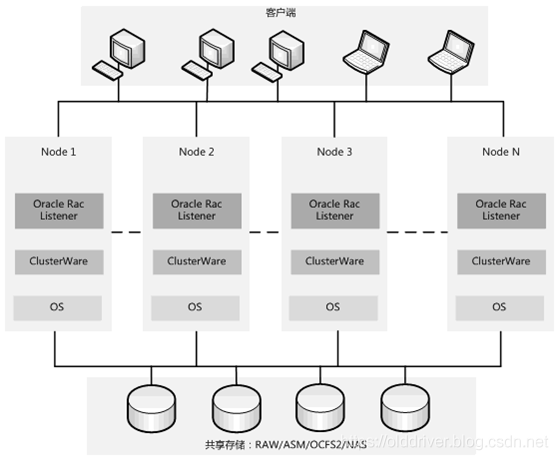 2.集群件(CRS) 集群件是安装在操作系统之上的一个特殊软件,负责管理整个集群环境中的硬件资源,并为上层的RAC集群提供基础服务。它与上层应用(例如数据库)的关系类似于单机环境中操作系统和应用程序的关系。单机环境下,OS能代理应用程序对硬件访问,但是在集群中有多台计算机,把整个集群想象成一台虚拟的计算机,那集群件就是这台虚拟计算机上的操作系统,RAC是运行在它上面的一个应用程序。