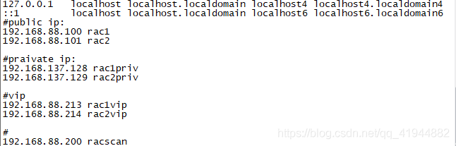 进入rac1的/etc/hosts文件,做以下配置
