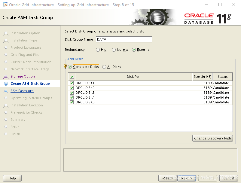 create diskgroup data_bak external redundancy disk ‘ORCL:TESTVG’,‘ORCL:TESTVG2’;很像创建表空间的语法,注意ASM DISK的书写,可以查询v$asm_disk.path字段来得到这些ASM DISK的正确路径。在create diskgroup语句完成后,DG将在当前操作的ASM实例中自动挂载,且添加到ASM实例的asm_diskgroups参数中。其他实例需要手工mount一下: