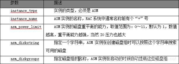 要想使用ASM,首要的工作就是创建ASM实例,既然是与数据库实例类似的实例,那么首先就需要有一个参数文件,只不过,ASM实例只需要关注少量的参数,与数据库的实例相比,比较特别的参数如下表所示: