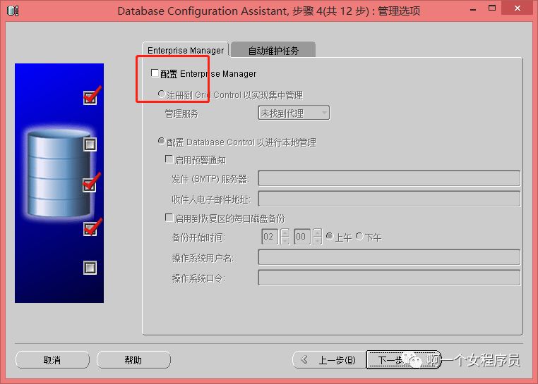 5、管理选项配置,不勾选配置Enterprise Manager,单击“下一步”;