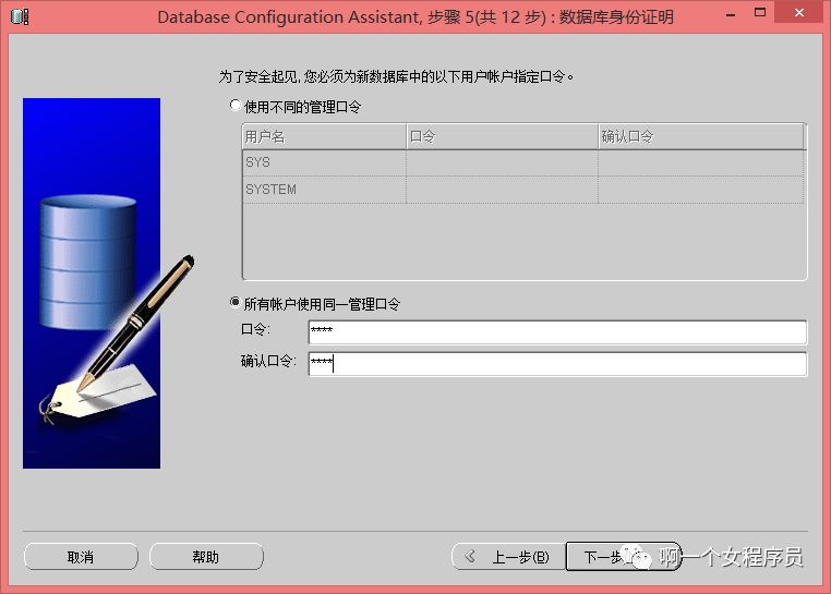 6、数据库身份证明,可以为不同的账户分别设置不同的管理口令,也可以为所有账户设置同一口令,单击“下一步”;