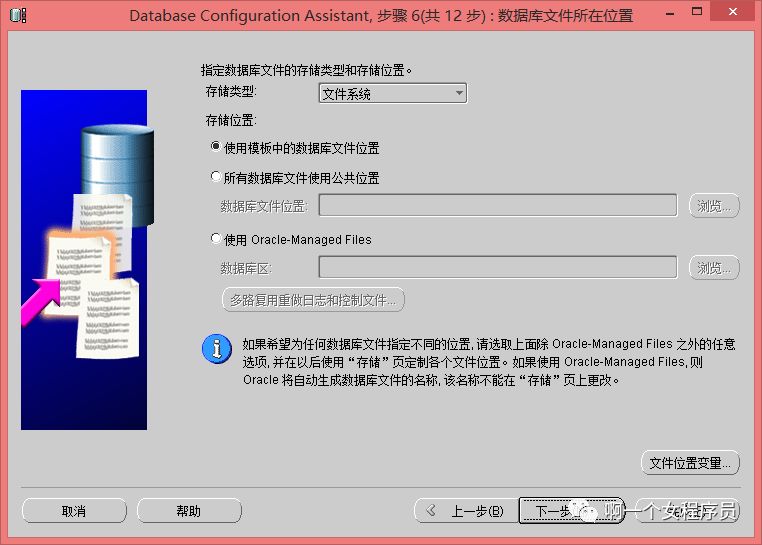 7、数据库文件所在位置,默认存储类型:文件系统,存储位置:使用模版中的数据库文件位置,也可以自己指定存储路径,单击“下一步”;