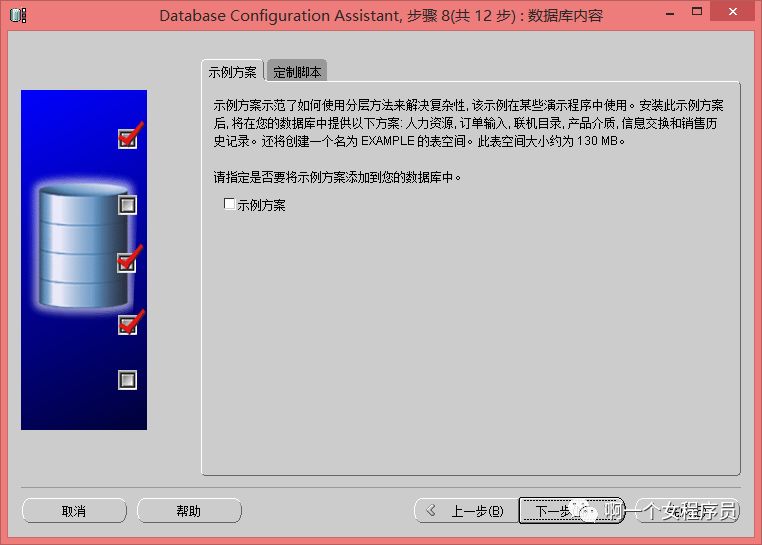 9、数据库内容,根据需要,选择是否添加示例方案,单击“下一步”;