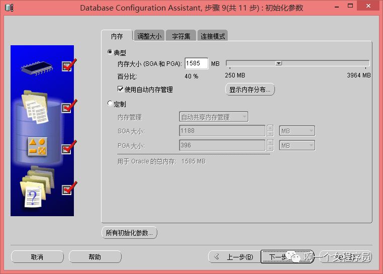 10、初始化参数,设置内存、字符集等,单击“下一步”;