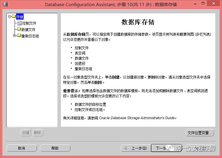 11、数据库存储,控制文件、数据文件、重做日志文件位置设置,单击“下一步”;
