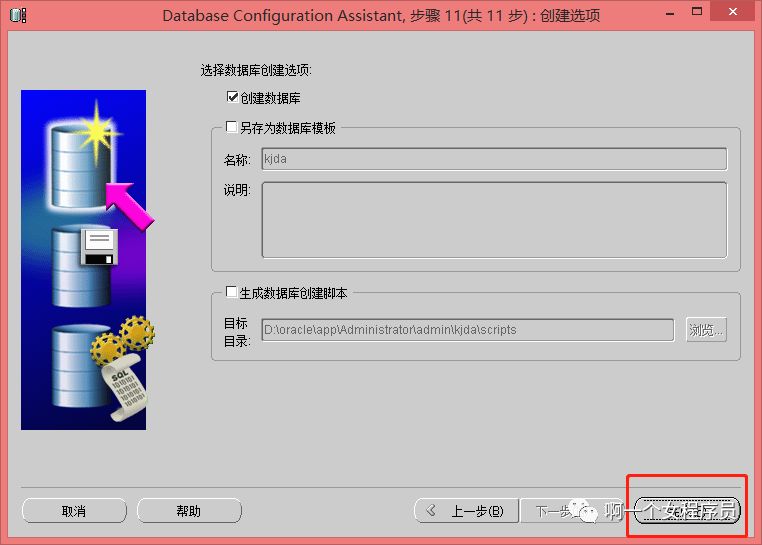 12、创建选项,创建数据库,生成脚本,单击“完成”,开始创建数据库。