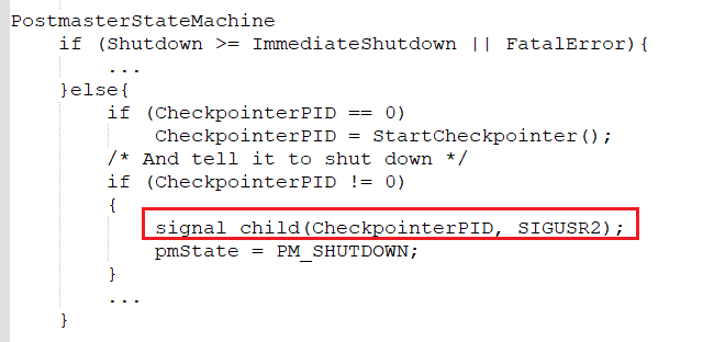 2)如果shutdown模式不为immediate,则集群shutdown的时候,postgres主进程会向checkpoint进程发送SIGUSR2信号: