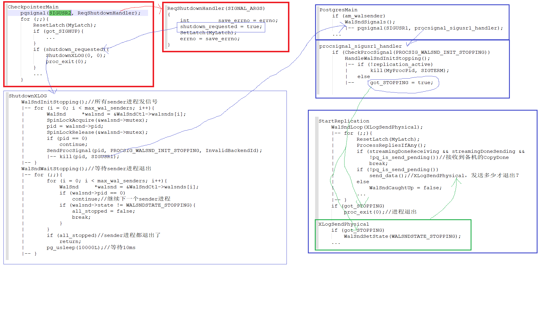 6)sender进程SIGUSR1信号处理函数procsignal_sigusr1_handler检查信号来自PROCSIG_WALSND_INIT_STOPPING,然后将got_STOPPING置为true