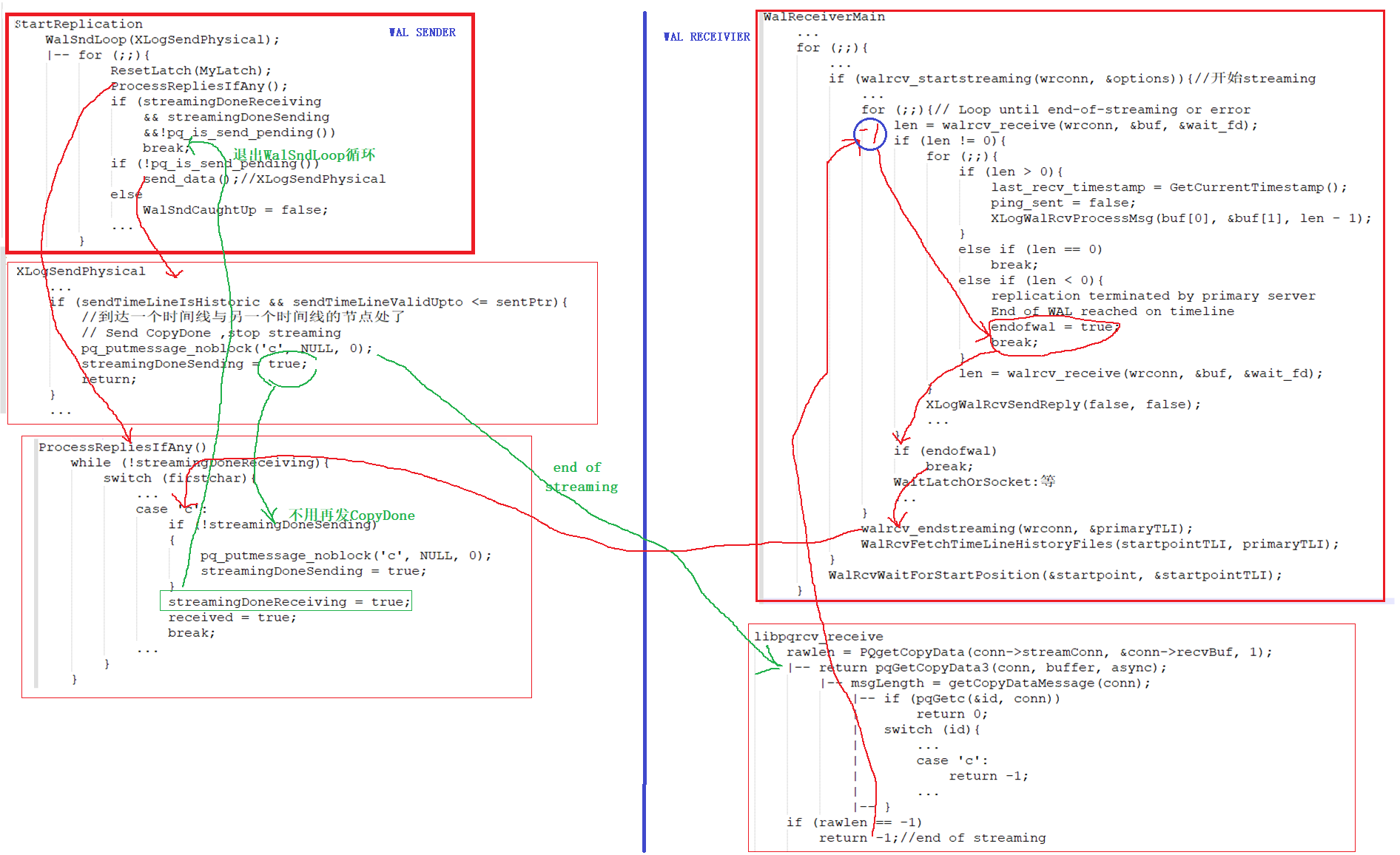 4)接着,返回到WalReceiverMain函数中,当walrcv_receive返回-1后,一路下来会退出接收消息和日志的循环,并进入walrcv_endstreaming再向primary发送个CopyDone消息
