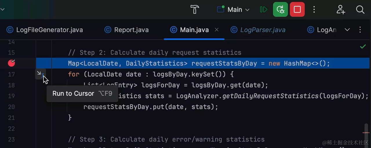 IntelliJ IDEA 2023.3.1 引入了一个新的 Run to Cursor(运行到光标)嵌入选项,该选项允许您在调试时执行到特定代码行。 程序挂起后,您可以将鼠标悬停在要执行到的代码行上,然后点击 Run to Cursor(运行到光标)弹出窗口。 您还可以在将文本光标置于所需行上后调用键盘快捷键 (Alt + F9) 来使用此功能。