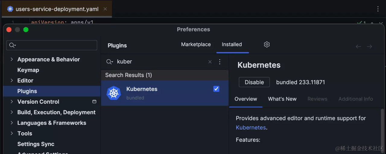 IntelliJ IDEA Ultimate 2023.3.1 捆绑了 Kubernetes 插件,因此,用于开发基于 Kubernetes 的应用程序的所有插件功能均开箱即用。 这项集成简化了直接从 IDE 部署、调试和管理 Kubernetes 集群的工作流。