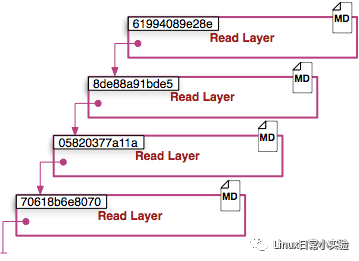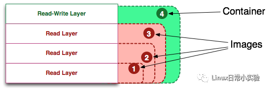 镜像跟容器的堆层显示,下面图示用公式 容器 = 镜像 + 读写层 来了解更清晰。