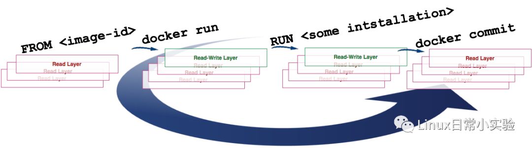 docker commit <container-id>--将容器的可读写层转换为一个只读层,这样就把一个容器转换成了不可变的镜像,其过程如下面两张图展示。