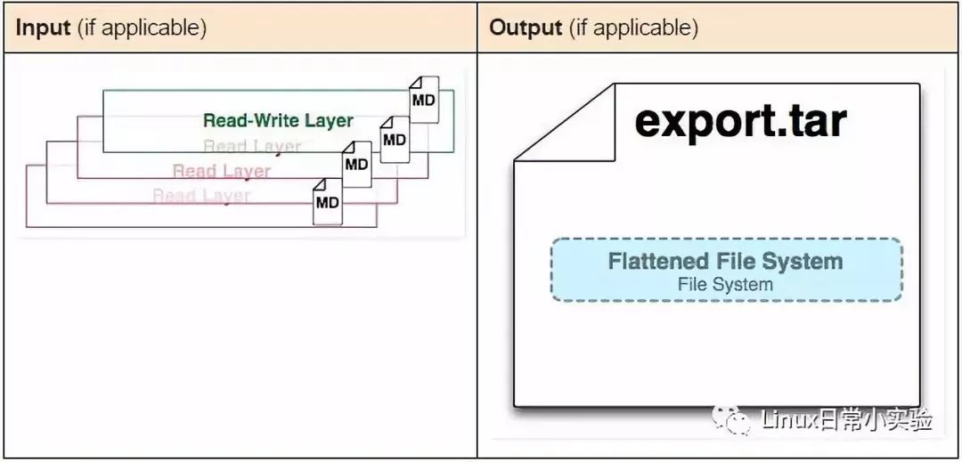 docker export <container-id>--创建一个tar文件,并且移除了元数据和不必要的层,将多个层整合成了一个层,只保存了当前统一视角看到的内容。