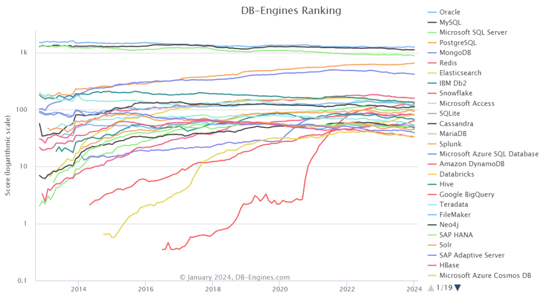 以下一副图是db-engines官网近期对当前主流数据库做的流行度排名,显示PostgreSQL近几年上升趋势猛进。