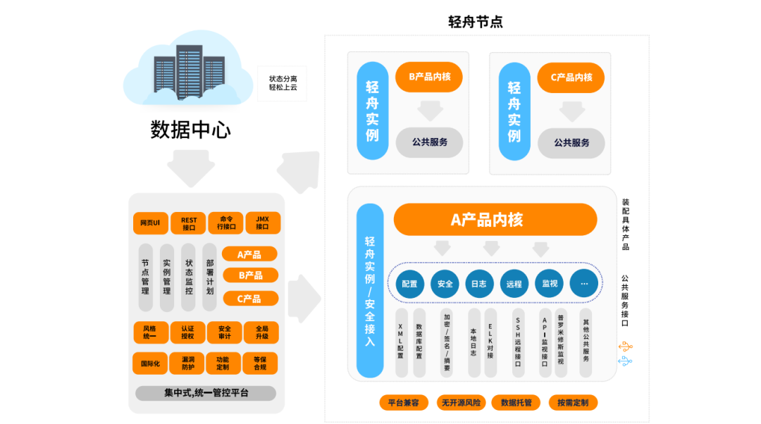 轻舟:是基于java语言实现的一款软件产品开发框架,其设计理念是充分复用软件开发过程中的架构设计和通用组件,以缩短产品的开发周期,并减轻上线后的运维成本。它总结了东方通在中间件软件类产品多年的开发经验,通过封装底层通用基础核心功能,只需要按照模板约束,编写简单POJO和注解,就可以自动实现软件的Web管理前后端功能,可以大幅提升软件管理类功能的开发效率。