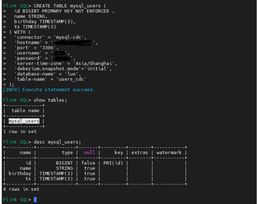 CREATE TABLE mysql_users (id BIGINT PRIMARY KEY NOT ENFORCED ,name STRING,birthday TIMESTAMP(3),ts TIMESTAMP(3)) WITH ('connector'= 'mysql-cdc','hostname'= '127.0.0.1','port'= '3306','username'= '','password'=’’,'server-time-zone'= 'Asia/Shanghai','debezium.snapshot.mode'='initial','database-name'= 'luo','table-name'= 'users_cdc');