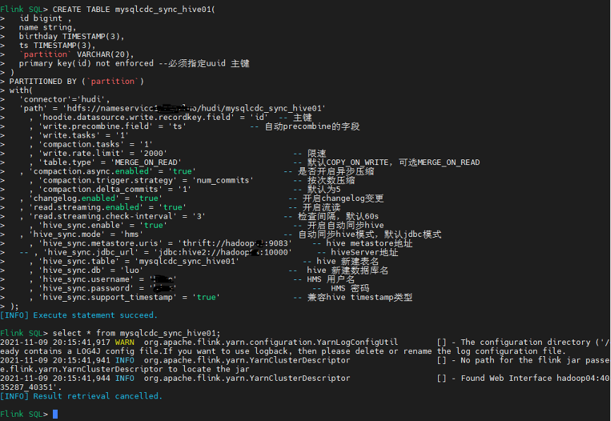 CREATE TABLE mysqlcdc_sync_hive01(id bigint ,name string,birthday TIMESTAMP(3),ts TIMESTAMP(3),`partition` VARCHAR(20),primary key(id) not enforced --必须指定uuid 主键)PARTITIONED BY (`partition`)with('connector'='hudi','path'= 'hdfs://nameservice /luo/hudi/mysqlcdc_sync_hive01', 'hoodie.datasource.write.recordkey.field'= 'id'-- 主键, 'write.precombine.field'= 'ts'-- 自动precombine的字段, 'write.tasks'= '1', 'compaction.tasks'= '1', 'write.rate.limit'= '2000'-- 限速, 'table.type'= 'MERGE_ON_READ'-- 默认COPY_ON_WRITE,可选MERGE_ON_READ, 'compaction.async.enabled'= 'true'-- 是否开启异步压缩, 'compaction.trigger.strategy'= 'num_commits'-- 按次数压缩, 'compaction.delta_commits'= '1'-- 默认为5, 'changelog.enabled'= 'true'-- 开启changelog变更, 'read.streaming.enabled'= 'true'-- 开启流读, 'read.streaming.check-interval'= '3'-- 检查间隔,默认60s, 'hive_sync.enable'= 'true'-- 开启自动同步hive, 'hive_sync.mode'= 'hms'-- 自动同步hive模式,默认jdbc模式, 'hive_sync.metastore.uris'= 'thrift://hadoop:9083'-- hive metastore地址-- , 'hive_sync.jdbc_url'= 'jdbc:hive2://hadoop:10000'-- hiveServer地址, 'hive_sync.table'= 'mysqlcdc_sync_hive01'-- hive 新建表名, 'hive_sync.db'= 'luo'-- hive 新建数据库名, 'hive_sync.username'= ''-- HMS 用户名, 'hive_sync.password'= ''-- HMS 密码, 'hive_sync.support_timestamp'= 'true'-- 兼容hive timestamp类型);